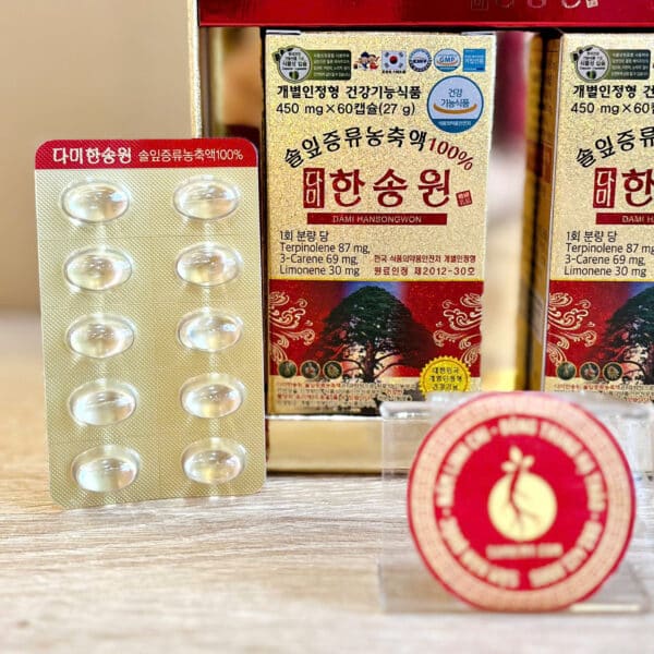 Tinh dầu thông đỏ Dami Hansongwon được chiết xuất dưới dạng viên tiện lợi và dễ sử dụng. Ngoài tác dụng chăm sóc sức khỏe, tinh dầu thông đỏ còn có tác dụng làm đẹp.